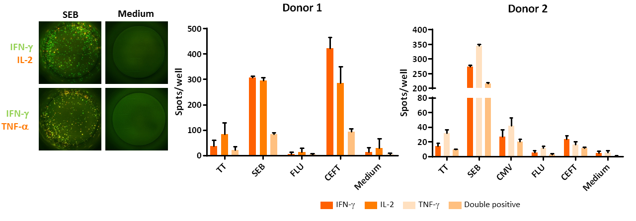 PBMCs were isolated from 2 healthy donors and, after cryopreservation, cells thawed and left to rest overnight. Subsequently, the cells were stimulated for 16 hours with tetanus toxoid (TT), Staphylococcal Enterotoxin B (SEB), influenza peptides (FLU) or CEFT (a peptide pool containing CMV, EBV, Flu and Tetanus toxoid peptides) in triplicate. Afterwards, IFN-γ, TNF-a and/or IL-2 production was assessed via FluoroSpot. Left, representative images for SEB-stimulated, or unstimulated wells, right, compilation data of cytokine producing cells (3 replicates per condition, mean count ± standard deviation).
